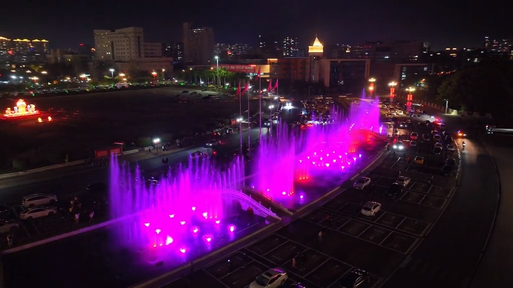 五彩斑斓的灯光与灵动的水柱交相辉映,